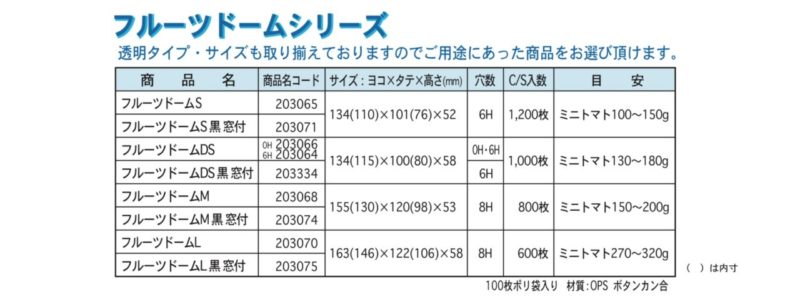 フルーツドームS、フルーツドームDS、フルーツドームM、フルーツドームL、透明タイプ・サイズも多くなって幅広い選択肢からベストな商品を選んでいただけます。