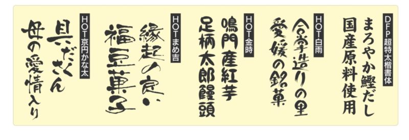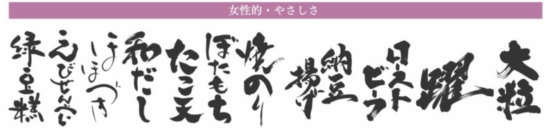 筆文字と言っても、オーソドックスな書体から、細い滑らかな書体、太くゴツゴツした書体、など様々です。