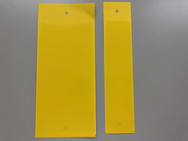 定植後より、作物の10㎝〜30㎝上に、付属の紙タイや、紐などを用いて吊り下げ、捕獲の場合は、10aあたり200〜500枚程度、予察の場合は10aあたり10枚程度設置して下さい。ハウスの入り口、畝の端、陽だまり等、害虫の発生しやすい場所に数多く吊り下げると効果的です。害虫対策の一つとして、是非取り入れてみてください。テストを行いたいとか、なんでも構いませんので小林までご連絡ください。