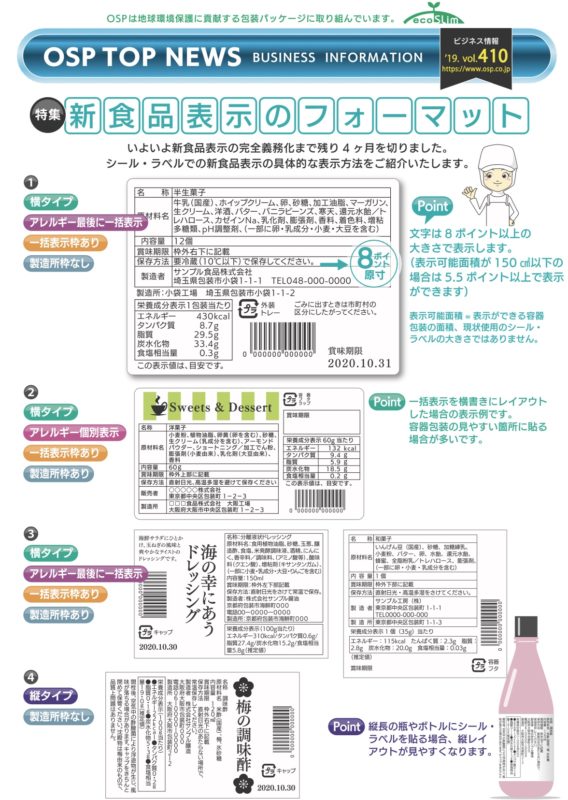 ブログ2020.03.02 kobayashi 2020年4月より適用!新食品表示のフォーマットについて 2020年4月より適用!新食品表示のフォーマットについて シール・ラベルでの表示方法の具体例です。 新表示への切替お済みでない場合はお早めに!!