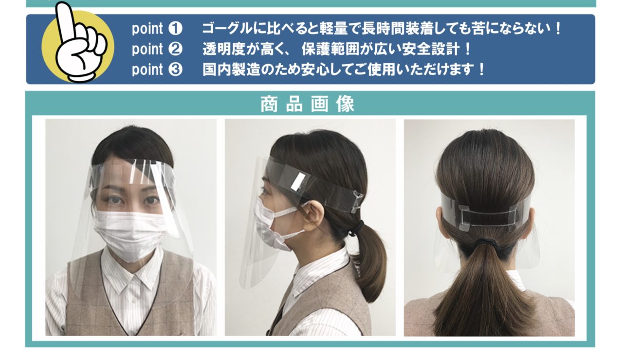 ブログ2020.08.18 2021.05.12 kobayashi ウイルス飛沫感染防止用などにご使用いただける【フェイスシールド】 ウイルス飛沫感染防止用などにご使用いただける【フェイスシールド】 興味のある方は、お問い合わせフォームよりお問い合わせください。