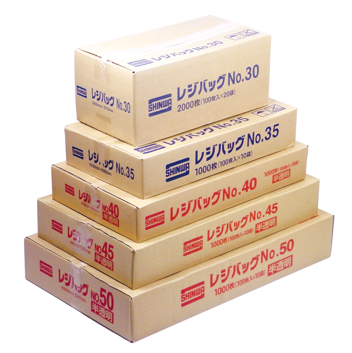 | 472004 | 信和レジバッグ No.45 | 300/450×550 | HDPE | 8.7 | 1,000枚入×2=2,000枚 | 100枚ブロック袋入り | エンボス加工を施しています。 |